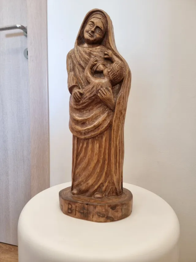 Dettagli del prodottoScultura in legno ARTISTA ITALIANO raffigurante una maternità o madonna e bambino.firmata in basso.