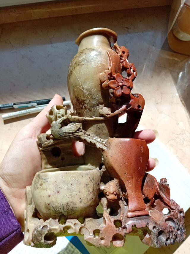 Dettagli del prodottoGraziosa scultura in pietra saponaria con vasi ,la fiori e animaletti. il colore della pietra Per nelle varie tonalità di Marrone e verde. peso sella scultura circa 1,3 kg .misure larghezza 17 altezza 24 . Bellissimi anche tutti i dettagli visibili nelle varie foto... Sono presenti qualche piccolo segno di usura tenuto esposto solo due mesi