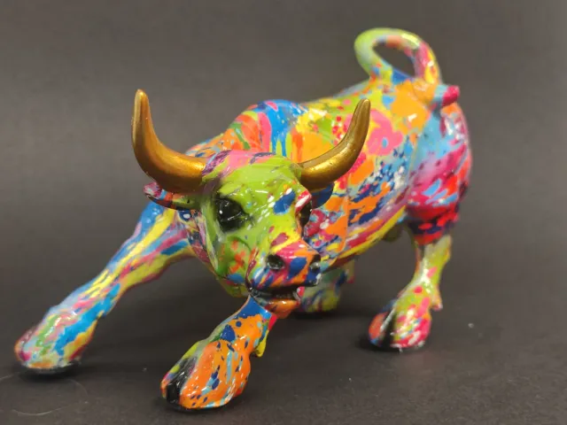 Dettagli del prodottoScultura in ceramica raffigurante un toro in stile pop art. L'opera presenta una vivace decorazione a spruzzo.