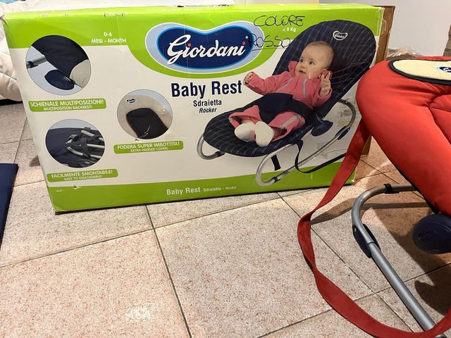 Dettagli del prodottoSdraietta Baby Rest Giordani, colore rosso. Adatta per neonati da 0 a 6 mesi o fino a 9 kg.