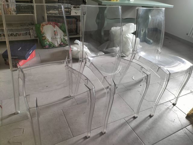 n.3 sedie da soggiorno, imitazione Kartell. prezzo complessivo di tutte le sedie. regalo 4'sedia leggermente crepata nello schienale, come da foto (in regalo).