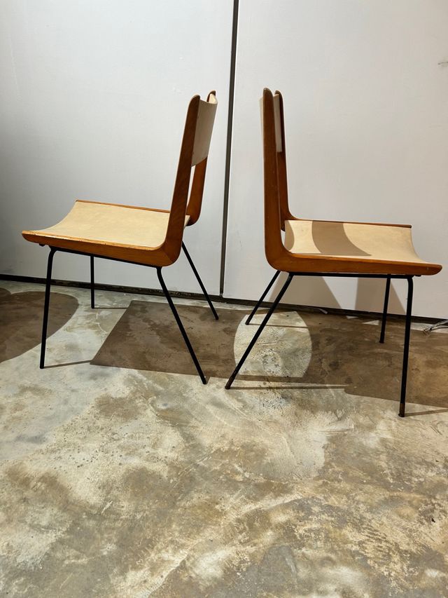 Dettagli del prodottocoppia sedie Boomerang anni '50 Design a Carlo De Carli di produzione Italiana ,completamente allo stato originale, trattata e sanificata, struttura in Rovere massello con copertura in Ecopelle di colore Panna, telaio in tondino di Ferro Misure del prodotto