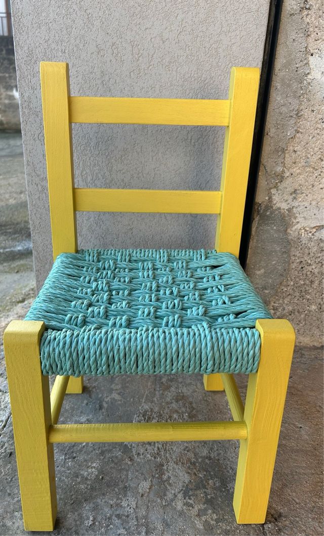Dettagli del prodottoPiccola sedia con struttura in legno verniciato di giallo vivace e seduta intrecciata con corda color acquamarina.