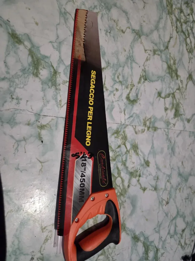 Segaccio per legno Cardinali da 18 pollici (450 mm). - Lama in metallo con dentatura per legno. - Manico ergonomico in plastica arancione e nera.