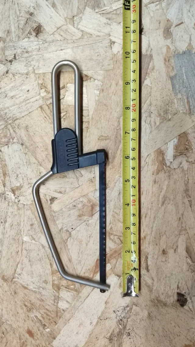 Seghetto a ferro con lama. - Struttura in metallo. - Impugnatura in plastica nera.