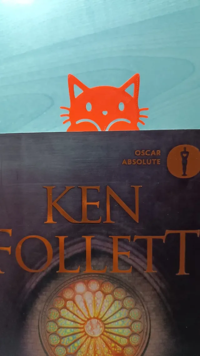 Dettagli del prodottoSegnalibro in plastica arancione a forma di gatto.