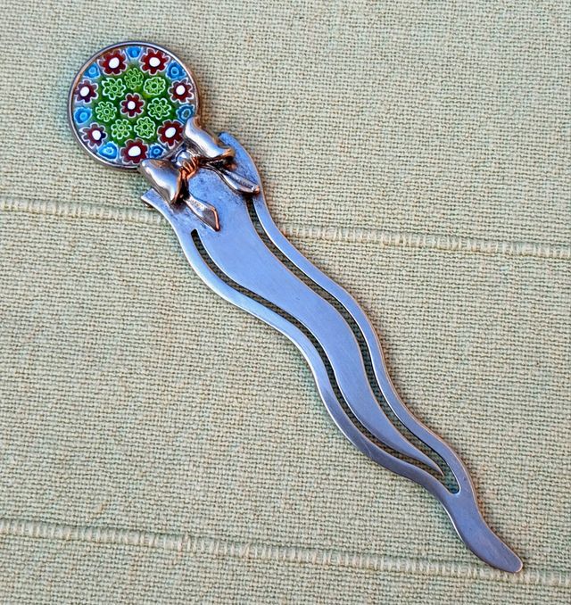Segnalibro in argento 925 punzonato con impugnatura decorata effetto murrina veneziana. Lunghezza cm 10