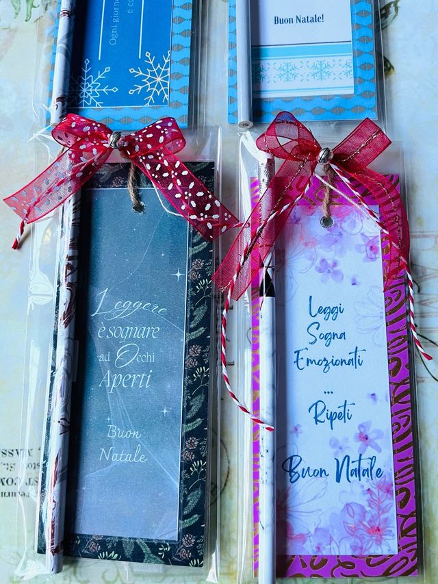 Dettagli del prodottoSet di 4 segnalibri natalizi plastificati con matite, perfetti per un pensiero speciale.