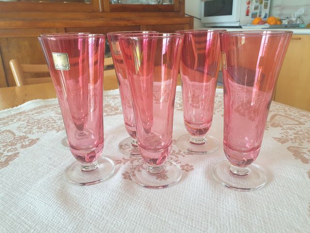 Dettagli del prodottoSei eleganti e semplici calici in vetro di forma slanciata ,gambo trasparente e coppa color rosso /rubino .