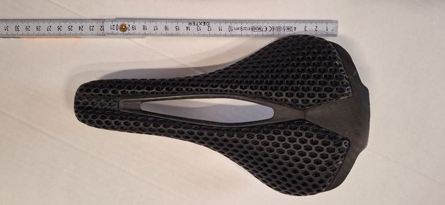Sella per bicicletta dal design moderno e accattivante. Carbonio con stampa 3D - Foro centrale per alleggerire il peso e migliorare la ventilazione.