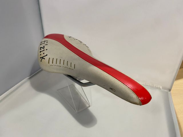 Sella da corsa bianca e rossa in pelle con piedistallo da arredamento. Marca FI'ZI:K