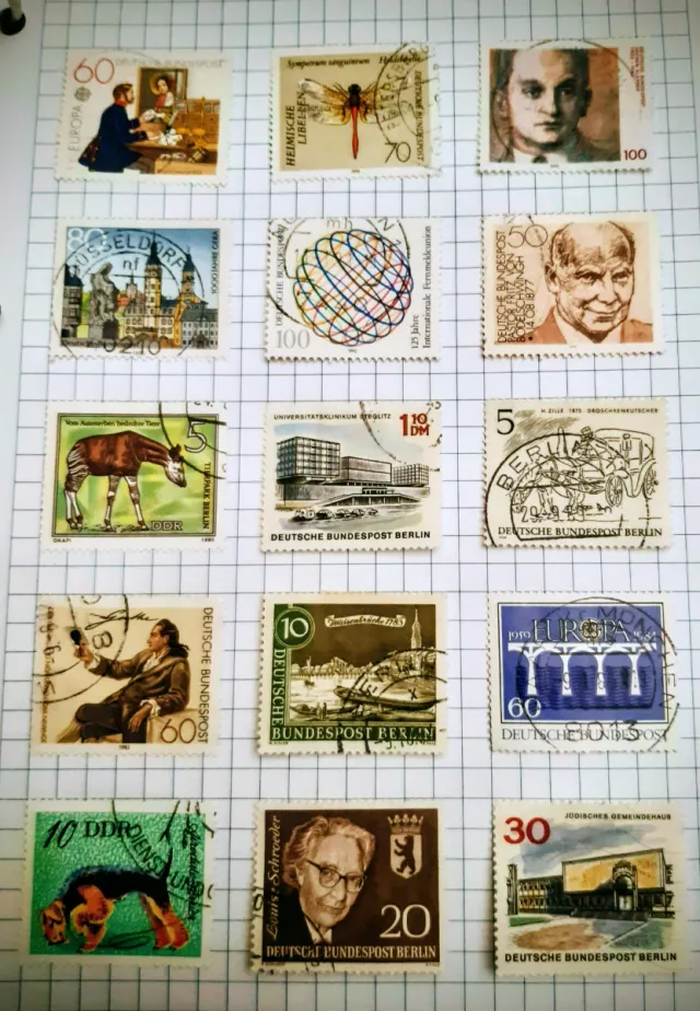 Dettagli del prodottoCollezione di francobolli della Germania. - Francobollo da 60 con motivo EUROPA. - Francobollo da 70 con HEIMISCHE LIBELLEN. - Francobollo da 100 con motivo Internationale Fernmeldeunion. - Francobollo da 100 di DÜSSELDORF. - Francobollo da 50 con ritratto. - Francobollo da 5 con TIRPARK BERLIN. - Francobollo da 10 DM di UNIVERSITÄTSKLINIKUM ERGLITZ. - Francobollo da 5 con carrozza. - Francobollo da 10 DDR con cane. - Francobollo da 20 con ritratto di Louis Schroeder. - Francobollo da 60 con BUNDESPOST BERLIN. - Francobollo da 10 con paesaggio fluviale. - Francobollo da 60 EUROPA con archi. - Francobollo da 30 di JÜDISCHES GEMEINDEHAUS. La descrizione è stata tradotta automaticamente.
