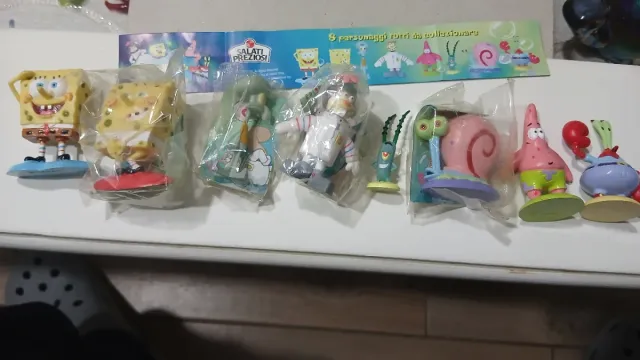 Dettagli del prodottoSerie completa di personaggi di Spongebob del 2005 distribuzione Salati Preziosi con cartina dimostrativa. 4 figure ancora imbustate all'origine.