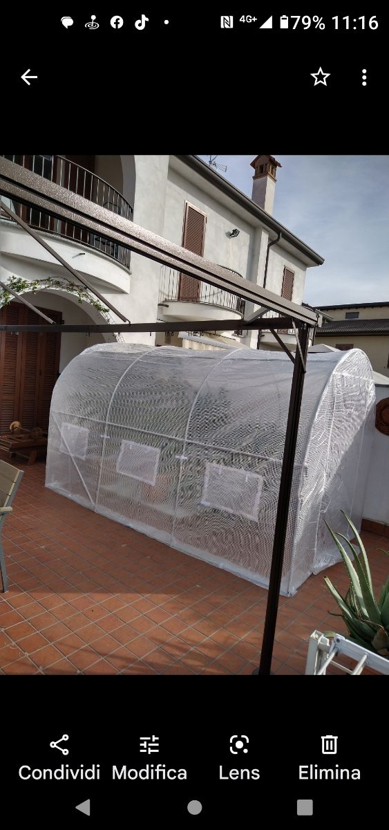Dettagli del prodottoSerra in buono stato, usata solo un inverno.Telo in polietilene e telaio in acciaio galvanizzato. Misure del prodotto