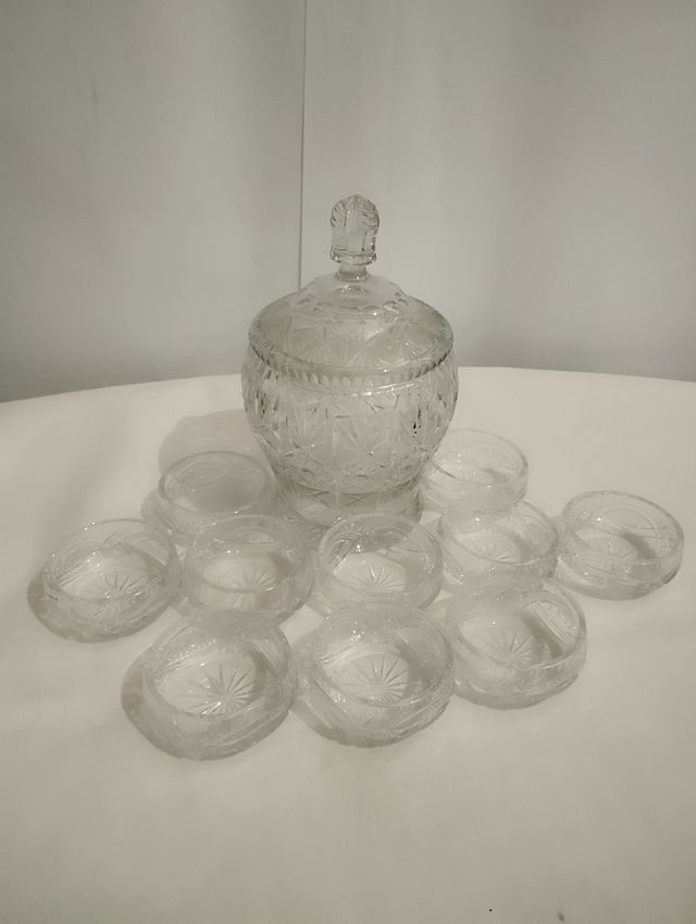Dettagli del prodottoServizio anni 70 da Macedonia in vetro, composto da 10 ciotole e un ampolla. Non ha difetti.
