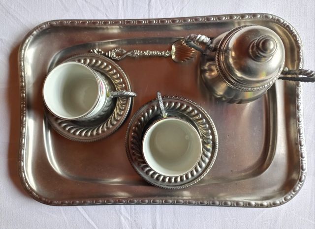 - Set composto vassoio, zuccheriera, due tazzine e piattini e cucchiaino.