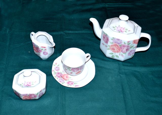 12 tazze da caffè con piatti – 1 Caffettiera – 1 Lattiera – 1 Zuccheriera.