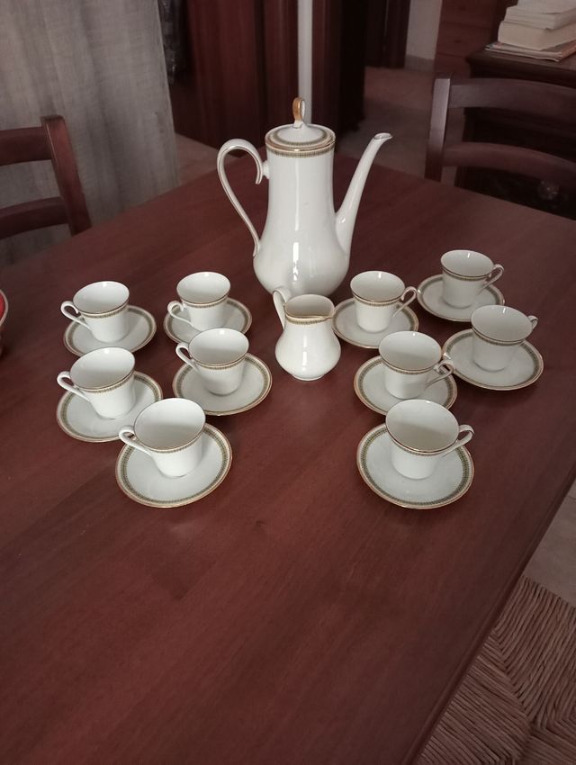 Servizio vintage circa anni 50-80. In porcellana decorata. Composto da 10 tazzine e 10 piattini, 1 teiera e una lattiera. Condizioni eccellenti.