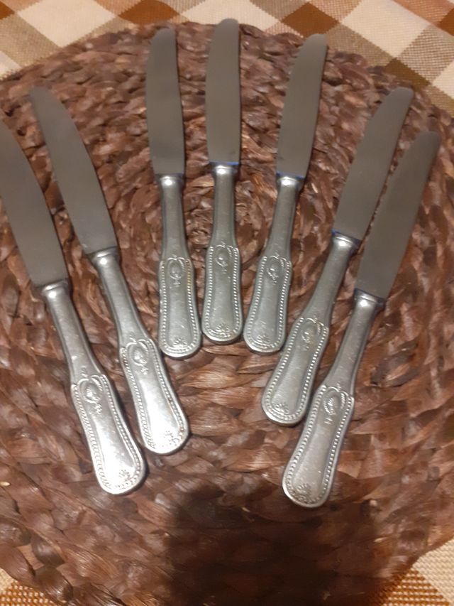 Dettagli del prodottoservizio di 7 coltelli vintage stile liberty della Albert in acciaio in ottime condizioni. la firma della Albert è sulla forchetta che è in foto ma ne ho una sola e non è in vendita