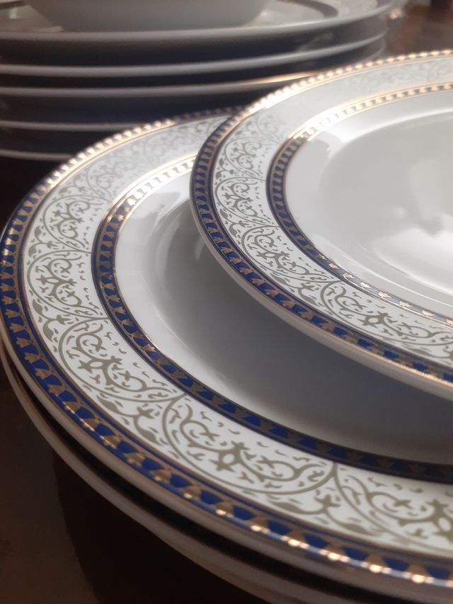 Dettagli del prodottoraffinato servizio di piatti per 18 persone in porcellana con decorazioni esterne in blue ed oro al centro color argento e di nuovo blue ed oro. un servizio per una bellissima tavola delle occasioni speciali. il set comprende