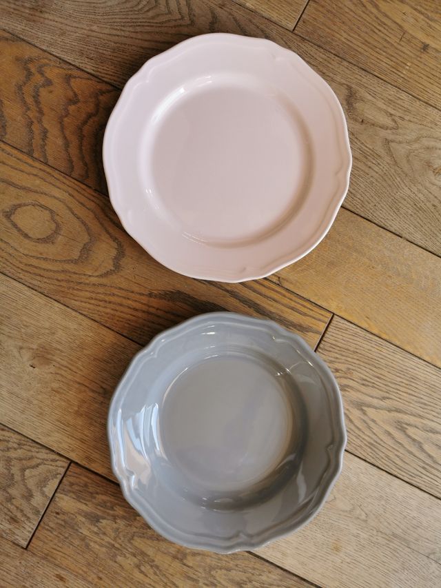 Servizio da 3 posti ikea piatto piano rosa e piatto fondo grigio. Molto capienti. Ceramica resistente