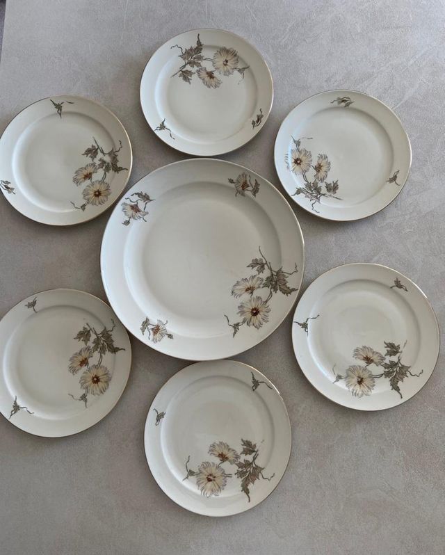 Dettagli del prodottoVendo servizio 6 piatti dolce e dessert vintage bavaria “ Seltmann Weidew” modello Liane di inizio ‘900. 1 piatto grande da portata + 6 piattini da dolce in porcellana bordata in oro zecchino, decorata con fiori . Misure piatto grande: diametro cm. 28, piatti piccoli: diametro cm. 19. Tutti i pezzi sono in ottime condizioni