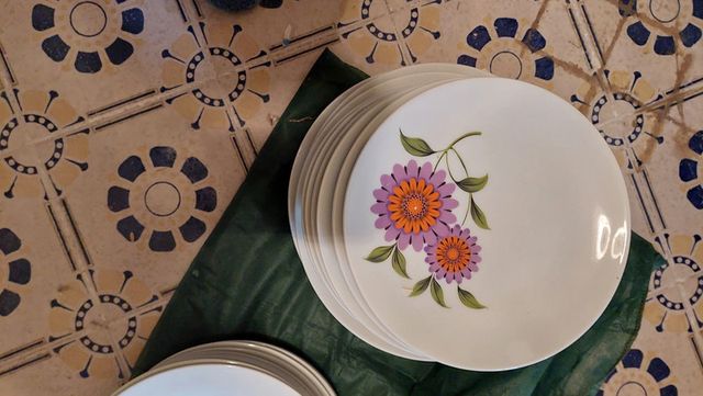 servizio di piatti in ceramica 12 piani, 12 fondi, 10 frutta e due piatti da portata. Motivo floreale anni '60.
