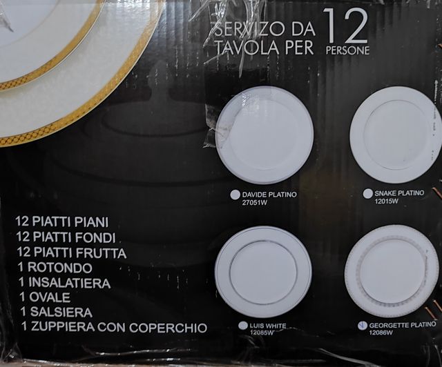 I colori sulle scatole sono solo a titolo di esempio, il colore reale è platino come si può vedere dalle due foto dei piatti reali.