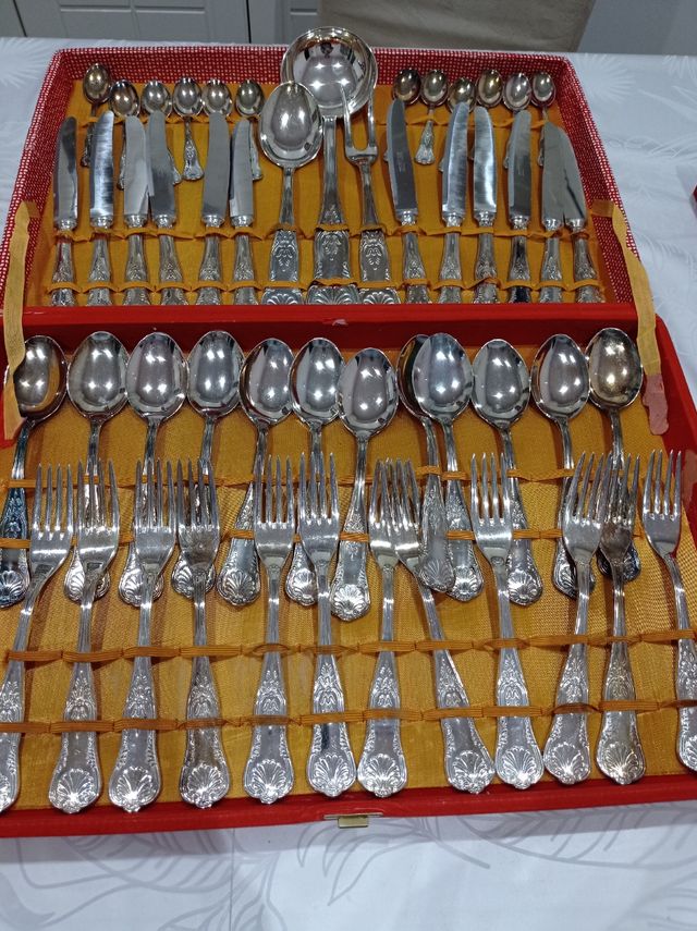 Dettagli del prodottoservizio posate completo in arg.800 da 12 posti .più 3 posate da portata ... totale 51 posate sono da lucidare ..mai usate scatola originale ma è un po' rovinata..