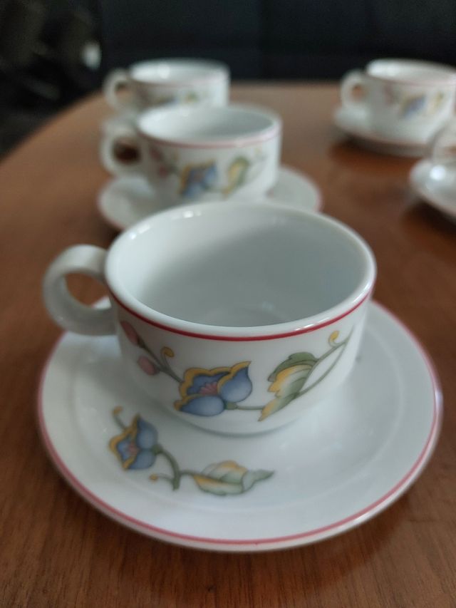 NUOVO bellissimo servizio in ceramica da caffè, set da 6 tazzine con relativo piattino, il tutto decorato da graziosi fiori delicati.