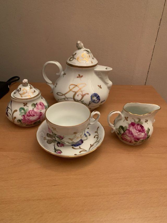 Servizio quattro pezzi, teiera, lattiera zuccheriera e tazza. Tutto dipinto a mano.