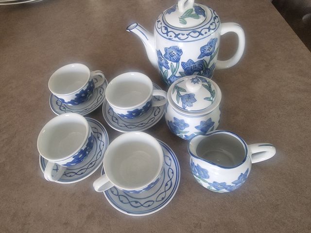 Servizio da tha in porcellana, bianco e blu. 4 tazze e 4 piattini, zuccheria, lattiera e teiera. Mai usato, in perfette condizioni.