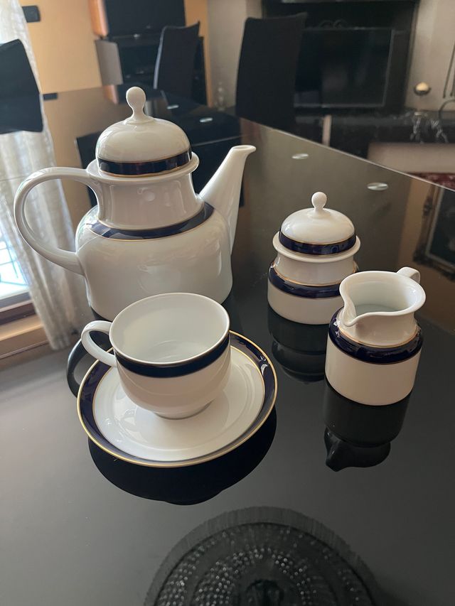Servizio da the composto da sei tazze e sei piattini zuccheriera e teiera,bricco latte in porcellana bavarese profilata in oro