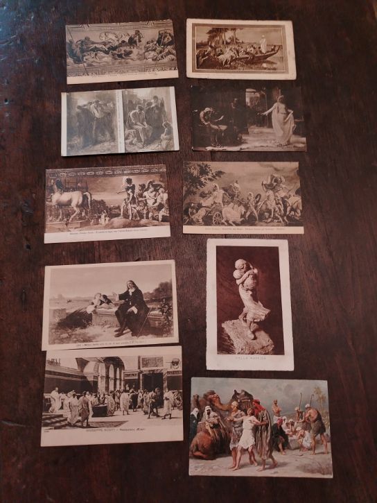 Dettagli del prodottoDieci cartoline antiche,bianco-nero,con immagini artistiche o allegoriche,formato piccolo(14x9 cm),in ottime condizioni.