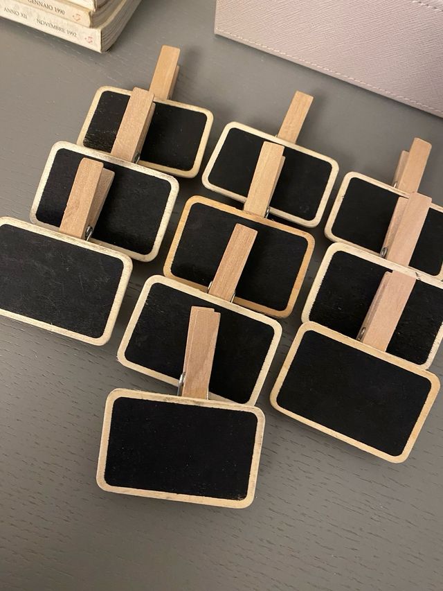 Dettagli del prodottoSet 10 mini lavagne in legno con molletta posteriore, dimensione singola lavagna 6x4 cm. Si può scrivere con un normale gesso non incluso. Nuove mai usate.