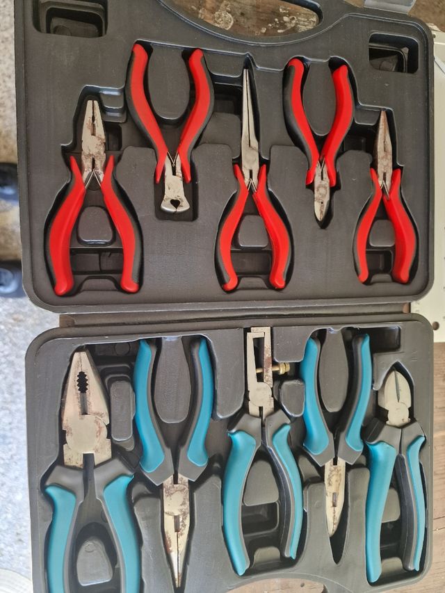 Vendo un set di 10 pinze meccaniche, metà con impugnatura rossa e metà con impugnatura turchese. - 5 pinze con impugnatura rossa - 5 pinze con impugnatura turchese