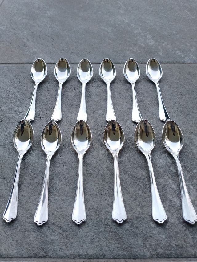 Set 12 cucchiaini placcati in argento. I cucchiaini sono lunghi 13 cm. In ottime condizioni.