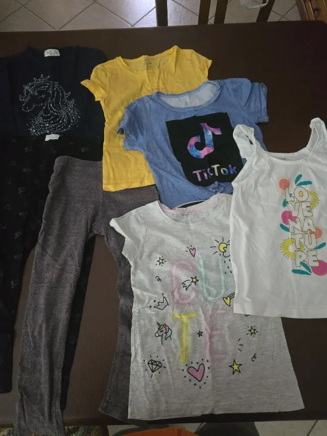 Dettagli del prodottoSet di abbigliamento misto in ottime condizioni per bambina (top, magliette, canotte, pantaloni, pantaloncino) 14 pezzi. Dai 5 agli 8 anni. Maniche corte tessuti leggeri in cotone. OVS, Piazza Italia, little kids, dopo dopo girls, Disney, Tik Tok.