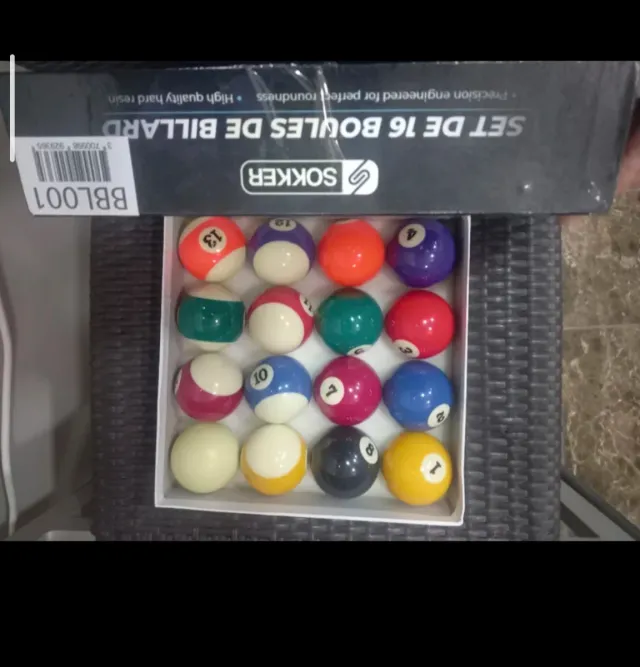 Dettagli del prodottoSet di 16 palline da biliardo americano (Pool) della marca SOKKER! ORIGINAL Professionale Tipo di gioco: Biliardo Americano / Pool (Includono 7 lisce, 7 righe, Palla 8 nera e Palla bianca) Stato: Come nuovo/non usato, conservato nella sua scatola originale. Le palline non presentano segni d'uso. Materiale: Resina dura di alta qualità, progettata per una perfezione sferica e un rotolamento fluido. Diametro: Standard 57mm (2 1/4 pollici), compatibile con la maggior parte dei tavoli da Pool. Peso: Ogni palla deve pesare circa tra 160 e 170 grammi. Palline nuove senza segni. Spedizioni tramite Wallapop. Non negoziabile. La descrizione è stata tradotta automaticamente.