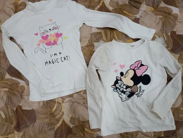 - Una maglietta bianca con stampa di Minnie Mouse e un gattino, con dettagli in pizzo sulle spalle.