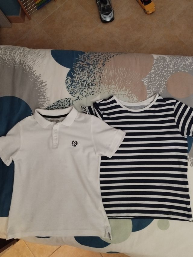 Dettagli del prodottoSet di due magliette per bambino, una bianca a tinta unita e una a righe blu e bianche.