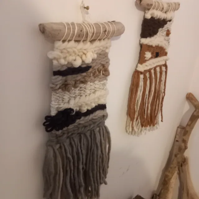 Dettagli del prodottoSet di due mini arazzi in lana con tonalità marroni e beige, perfetti per decorare con un tocco rustico.
