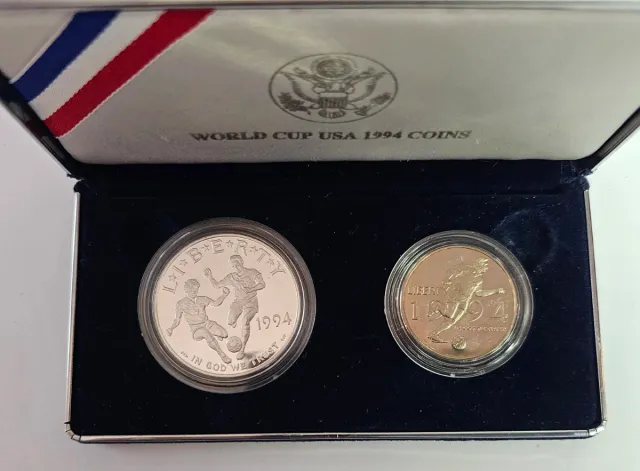 Dettagli del prodottoSet di due monete commemorative in argento 900 ,peso gr 26,73,diametro mm 38, 1.Mezzo Dollaro:rame-nikel,peso gr 11,34 ,diametro mm 30,61 per la Coppa del Mondo FIFA USA 1994.