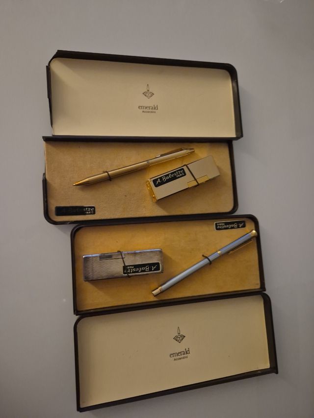 Bellissimo set composto da due penne e due accendini A. Balestre Paris. Anni 80 mai usati Non so se funzionano e una penna ha solo l involucro esterno