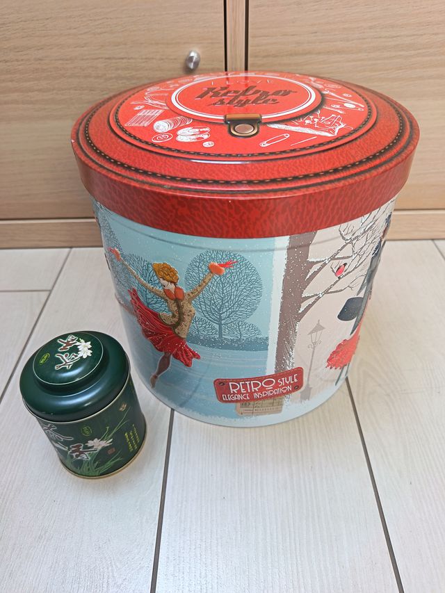 Dettagli del prodottoSet composto da due scatole in latta per conservare il tè, una di grandi dimensioni e una più piccola.
