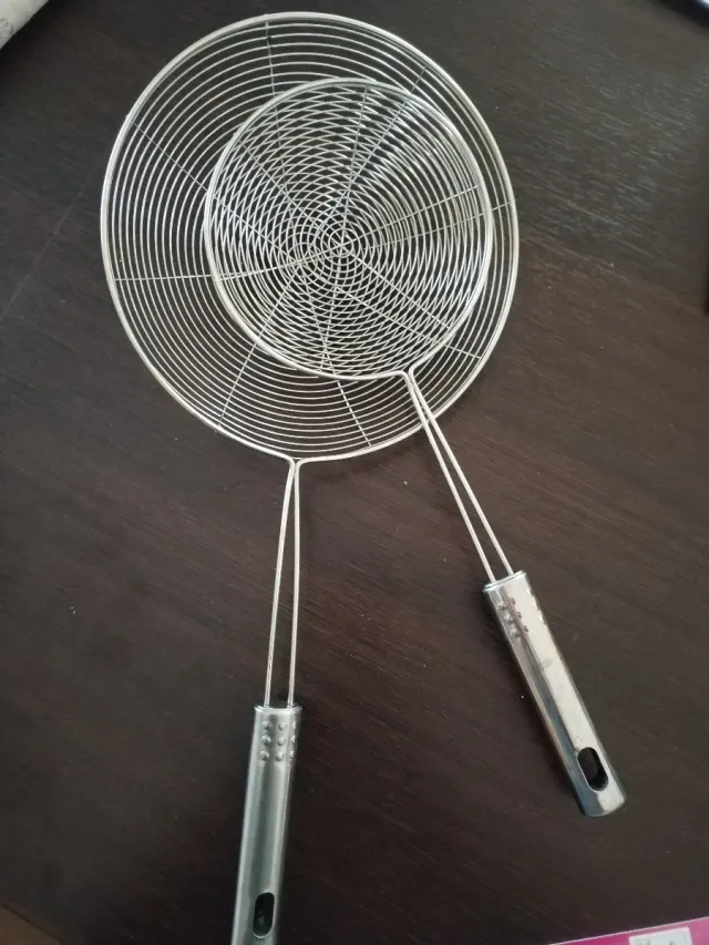Dettagli del prodottoSet di due schiumarole o colini in acciaio inossidabile, ideali per scolare o raccogliere cibi.