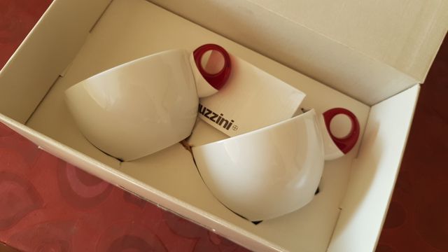 Set 2 tazze per colazione Guzzini bianche, con manico bicolor bianco e rosso, mai usate, ancora complete di scatola