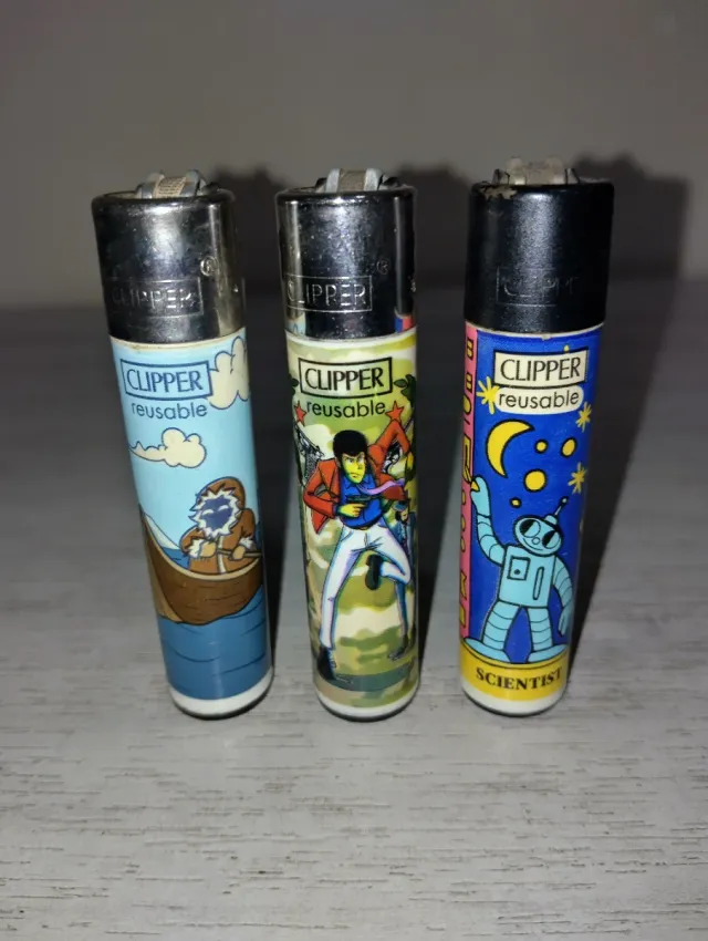 Dettagli del prodottoTre accendini Clipper riutilizzabili con diverse grafiche.