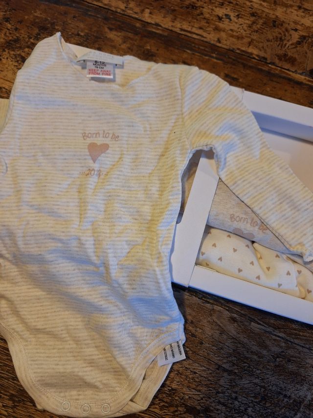 Set di tre body per neonato in cotone naturale, perfetti per i primi mesi. - Taglia 6-12 mesi. - Design a righe sottili. - Stampa Born to be 2018 con cuore.
