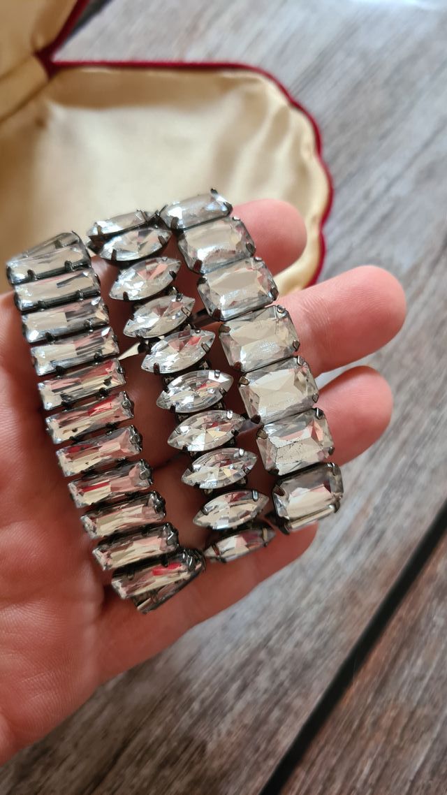 ✨ Elegante set di 3 bracciali vintage anni ’60–’70 con cristalli color bianco ghiaccio montati su struttura color canna di fucile.